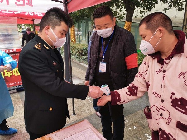 “我在新聞上看到醫(yī)護(hù)人員和基層干部夜以繼日奮戰(zhàn)在疫情防控一線,覺得他們十分辛苦,自己也想?yún)⑴c進(jìn)來,希望能為家鄉(xiāng)的疫情防控工作出份力,幫個(gè)忙?!闭谂R泉縣田橋街道三合社區(qū)中泰錦城小區(qū)卡點(diǎn)的一名志愿者深切的說道。這名志愿者叫王運(yùn)龍,已有9年黨齡的他,2011年參軍,目前是湖南懷化96834部隊(duì)的火箭軍戰(zhàn)士。