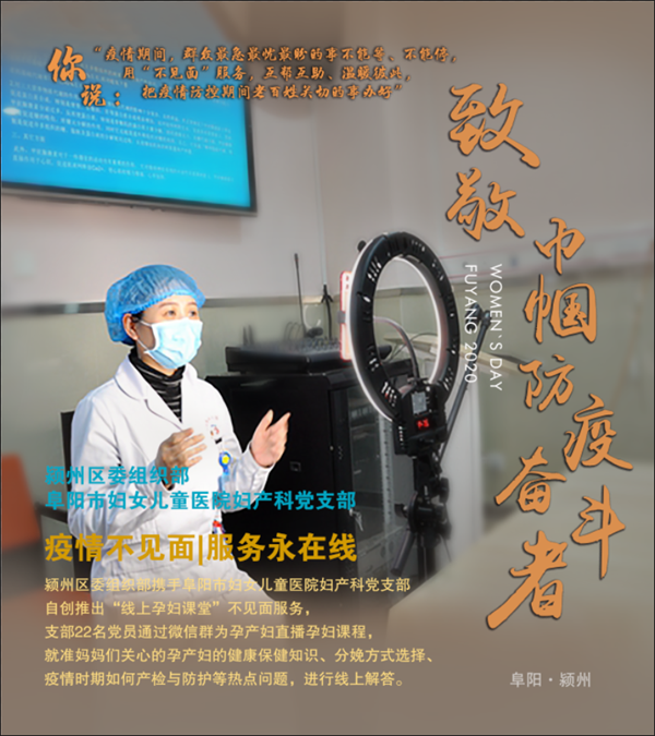 2月26日,潁州區(qū)委組織部、阜陽(yáng)市婦女兒童醫(yī)院婦產(chǎn)科黨支部自創(chuàng)“線上孕婦課堂”上線了,支部22名黨員通過微信群為孕產(chǎn)婦直播孕婦課程,讓孕媽們學(xué)習(xí)到正確的防疫知識(shí),就孕媽媽們關(guān)心的孕產(chǎn)婦的健康保健知識(shí)、分娩方式選擇、疫情時(shí)期如何產(chǎn)檢與防護(hù)等熱點(diǎn)問題,進(jìn)行線上解答。微信群一上線就受到孕媽媽的歡迎,15分鐘服務(wù)群里關(guān)注量過百,通過專家在線上的解答緩解準(zhǔn)媽媽們疫期緊張不安的情緒,足不出戶的就學(xué)到孕產(chǎn)期的相關(guān)知識(shí),讓孕媽順利渡過孕產(chǎn)期。