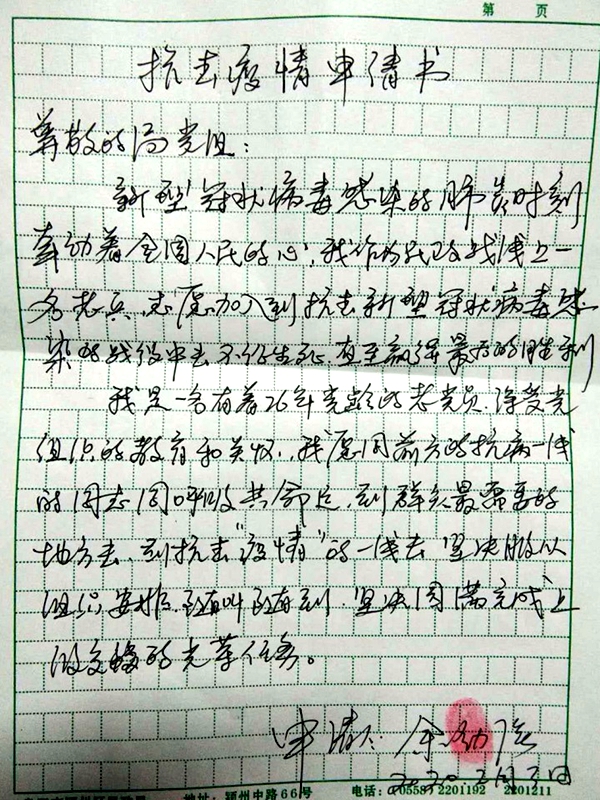 余勁強(qiáng)的抗擊疫情申請(qǐng)書