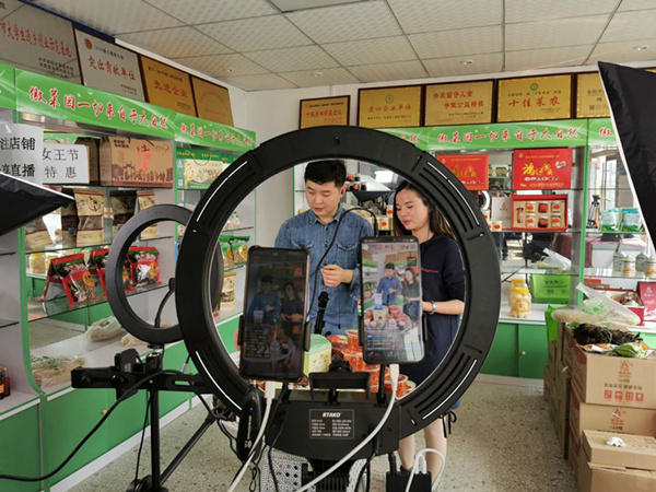 “今天的第一款商品農家手工粉絲,在線下單還有優(yōu)惠!朋友們,關注一下,還可以助力脫貧!”在寧老莊鎮(zhèn)梅寨村安徽徽菜園食品有限公司,兩名主播正在運用抖音、拼多多平臺現場直播銷售芥菜絲、黃豆醬等土特產,活動現場還有寧老莊鎮(zhèn)黨委副書記、鎮(zhèn)長朱杰親自參與代言,本次直播共三個小時售出1000多單,銷售額達2萬余元。