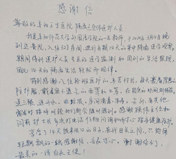 3月4日,在菲律賓讀博的她回到阜陽。14天隔離期已滿,她將這段時間的所見所感寫成一封“感謝信”。在離開之時,她鄭重地將這封信送到隔離點醫(yī)護人員手里,并隨手拍下了她們的照片。照片中,工作人員們身著白色防護服,帶著口罩、護目鏡和手套。衣服上寫著:歡迎回家……