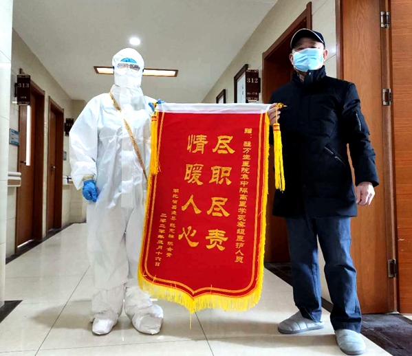 “出區(qū)的時候,我跟他們要聯(lián)系方式,想在疫情結束后感謝她們。人家卻說,只要我們一家人好好地,比啥都強,說啥都不給。我就送給她們一面錦旗感謝她們?!?/span>