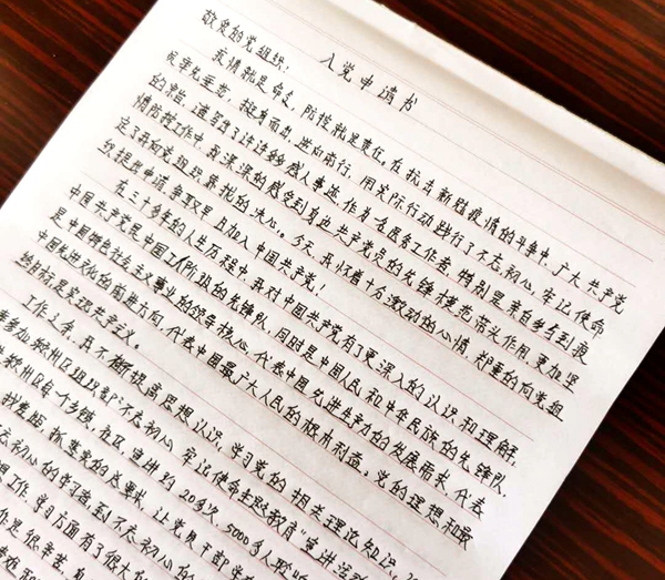 “這一個多月里,我成長了許多。經(jīng)過這次抗疫,特別是親自參與到疫情防控工作中,我深深的感受到身邊共產(chǎn)黨員的先鋒模范帶頭作用,更加堅定了我向黨組織靠攏的決心。今天,我懷著十分激動的心情,鄭重地向黨組織提出申請,爭取早日加入中國共產(chǎn)黨!”她在申請書中寫道。