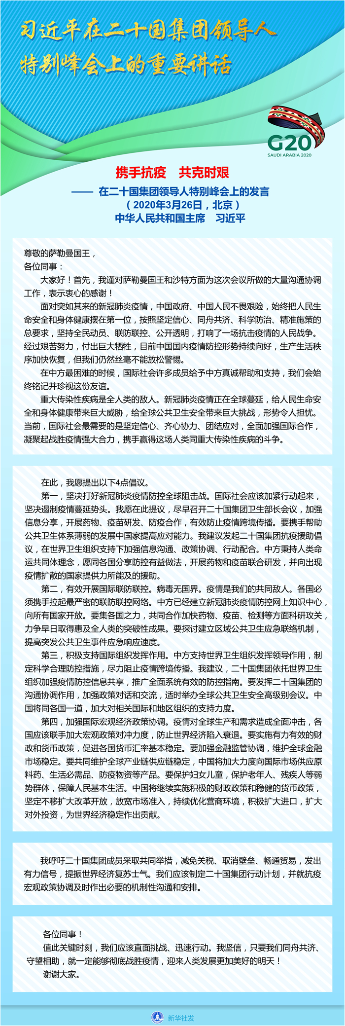 習(xí)近平出席二十國(guó)集團(tuán)領(lǐng)導(dǎo)人應(yīng)對(duì)新冠肺炎特別峰會(huì)并發(fā)表重要講話