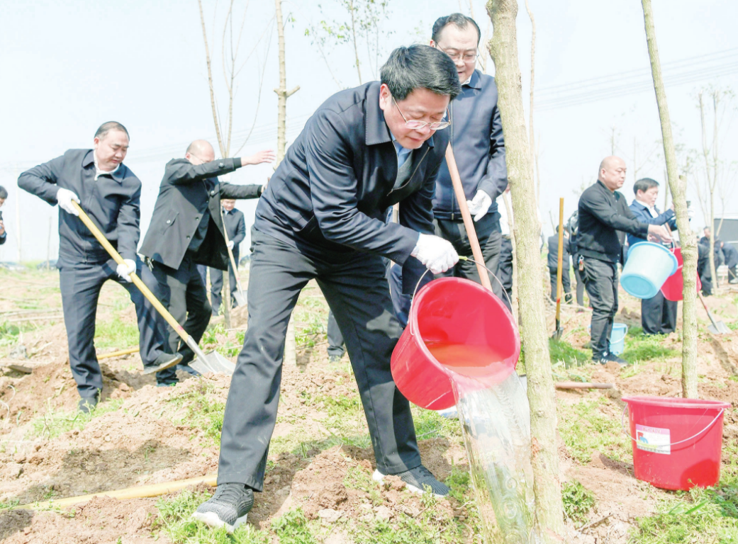 春日的泉水灣濕地公園,草木吐綠,萬物勃發(fā)。楊光榮、孫正東等一行來到植樹點(diǎn),和在場的干部群眾、志愿者一道投入到勞動中,扶正樹苗、揮鍬培土、拎桶澆水……植樹現(xiàn)場一派繁忙景象。在和煦的春風(fēng)中,一排排新栽的五角楓、桂花等景觀樹挺立在老泉河畔,為春天的大地增添了更多綠意和生機(jī)。