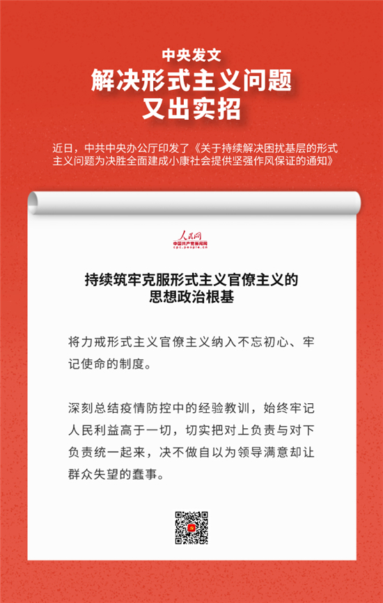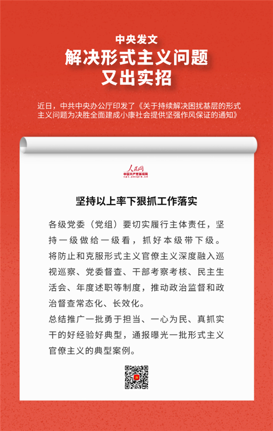 編者按:近日,中辦印發(fā)《關(guān)于持續(xù)解決困擾基層的形式主義問題為決勝全面建成小康社會(huì)提供堅(jiān)強(qiáng)作風(fēng)保證的通知》,通知要求牢固樹立正確政績觀,始終牢記人民利益高于一切,切實(shí)把對(duì)上負(fù)責(zé)與對(duì)下負(fù)責(zé)統(tǒng)一起來,決不做自以為領(lǐng)導(dǎo)滿意卻讓群眾失望的蠢事。