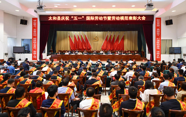 15時,大會開始,全體起立,奏唱國歌。縣委副書記潘江徽宣讀了《中共太和縣委太和縣人民政府關于表彰太和縣勞動模范、先進工作者和先進集體的決定》,授予朱杰等43名同志“太和縣勞動模范”稱號、授予王萬里等17名同志“太和縣先進工作者”稱號、授予安徽華源醫(yī)藥集團股份有限公司等20個單位“太和縣先進集體”稱號。太和縣領導班子為10名先進個人和10個單位代表進行頒獎。