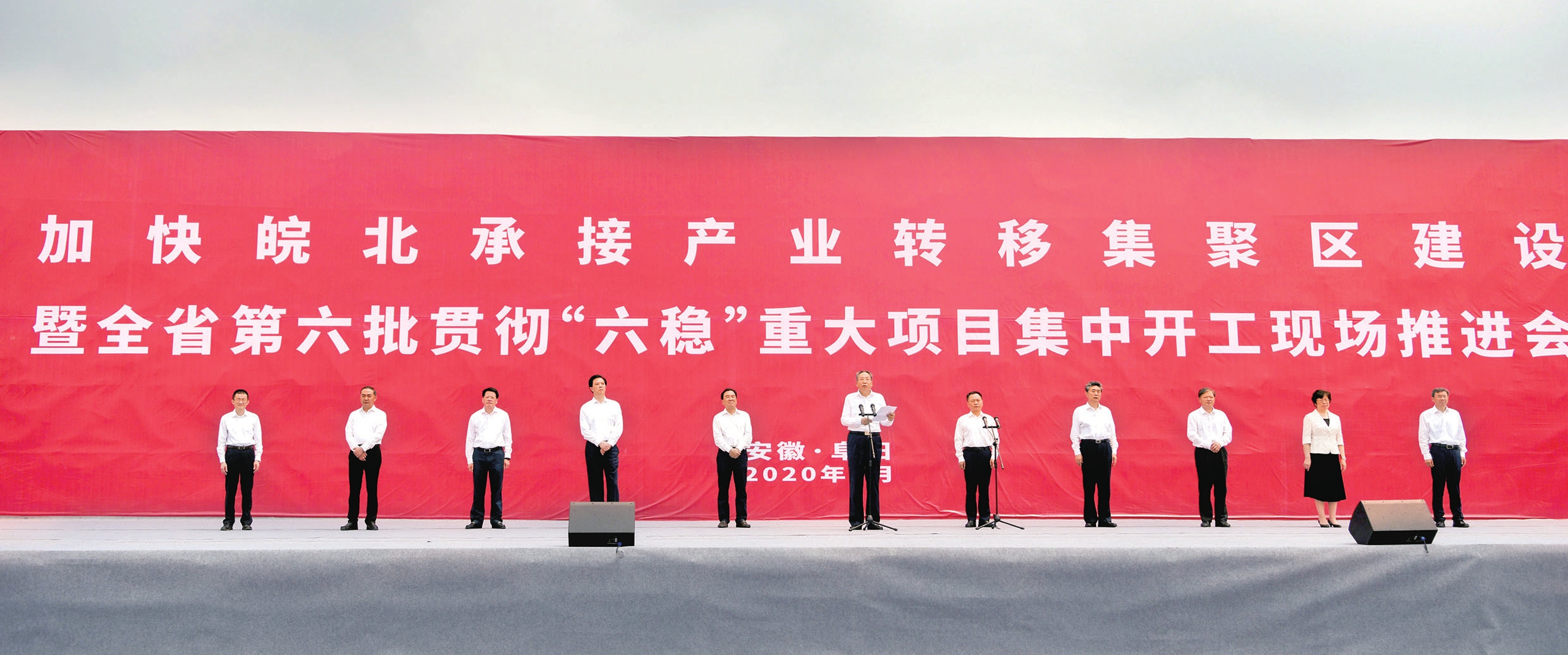 6月20日上午,加快皖北承接產(chǎn)業(yè)轉(zhuǎn)移集聚區(qū)建設(shè)暨全省第六批貫徹“六穩(wěn)”重大項(xiàng)目集中開(kāi)工現(xiàn)場(chǎng)推進(jìn)會(huì)在我市界首市田營(yíng)科技園區(qū)舉行。省委書(shū)記李錦斌講話并宣布開(kāi)工,省長(zhǎng)李國(guó)英主持。省委副書(shū)記信長(zhǎng)星,省領(lǐng)導(dǎo)鄧向陽(yáng)、陶明倫、李明、劉莉出席,副省長(zhǎng)、市委書(shū)記楊光榮發(fā)言,市長(zhǎng)孫正東等參加。