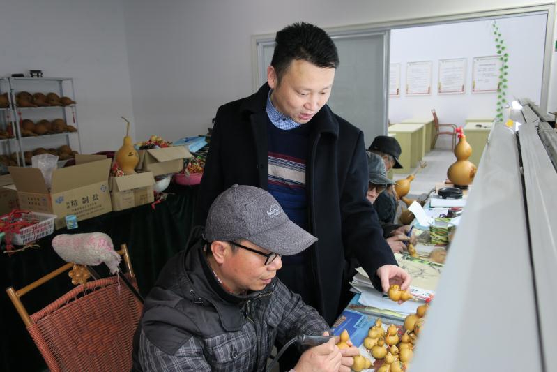 ●顏亮亮到工藝品廠看望學(xué)習(xí)葫蘆烙畫技術(shù)的貧困戶