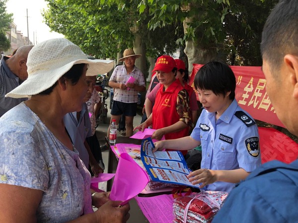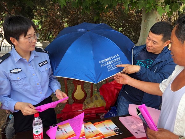 在草寺集人員密集處設(shè)立了普法宣傳咨詢服務(wù)臺(tái),懸掛宣傳橫幅,工作人員向過(guò)往群眾宣傳禁毒、防詐騙、掃黑除惡、信訪“兩個(gè)條例”等相關(guān)法律法規(guī)內(nèi)容,告知群眾身邊如存在“村霸”、“欺行霸市”等黑惡勢(shì)力,要積極揭發(fā)檢舉,公布有獎(jiǎng)舉報(bào)方式及聯(lián)系電話。志愿者幫助群眾關(guān)注微信普法公眾號(hào),下載學(xué)習(xí)《民法典》等相關(guān)內(nèi)容。為了讓群眾對(duì)所學(xué)知識(shí)更加深入了解和掌握,工作人員根據(jù)所宣傳內(nèi)容,選出10道問(wèn)答題,回答正確的贈(zèng)送一把印有“平安建設(shè)”二維碼的雨傘,現(xiàn)場(chǎng)群眾踴躍舉手答題,爭(zhēng)先恐后搶答,現(xiàn)場(chǎng)氣氛活躍,場(chǎng)面熱鬧非凡。并向參與者發(fā)放圍裙、手提袋等宣傳物品。