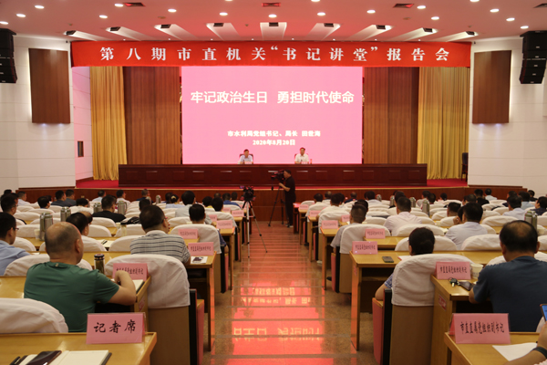 8月20日上午,市直工委在市政府一樓會議室舉行第八期市直機(jī)關(guān)“書記講堂”報告會。市水利局黨組書記、局長田世海作了題為“牢記政治生日 勇?lián)鷷r代使命”的報告,市直工委書記李濤主持報告會。市直各直屬黨組織副書記、市直機(jī)關(guān)理論宣講員、市水利局系統(tǒng)黨員干部代表等150余人參加了報告會。
