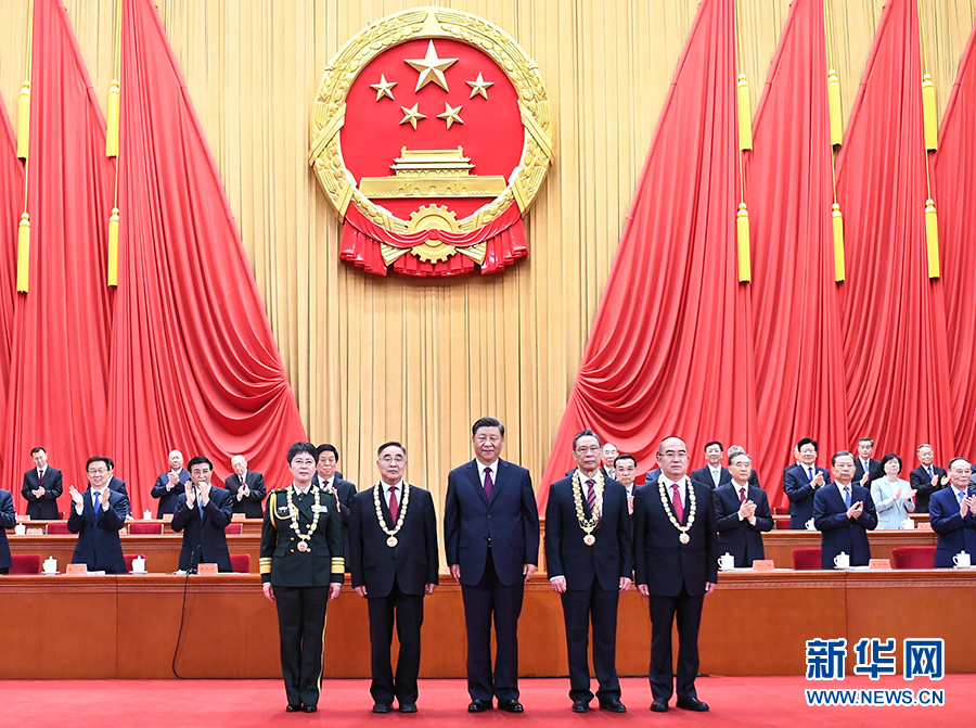 栗戰(zhàn)書(shū)宣讀習(xí)近平簽署的中華人民共和國(guó)主席令。主席令指出,為了隆重表彰在抗擊新冠肺炎疫情斗爭(zhēng)中作出杰出貢獻(xiàn)的功勛模范人物,弘揚(yáng)他們忠誠(chéng)、擔(dān)當(dāng)、奉獻(xiàn)的崇高品質(zhì),根據(jù)第十三屆全國(guó)人民代表大會(huì)常務(wù)委員會(huì)第二十一次會(huì)議的決定,授予鐘南山“共和國(guó)勛章”,授予張伯禮、張定宇、陳薇“人民英雄”國(guó)家榮譽(yù)稱(chēng)號(hào)。