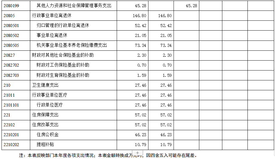 6.社會保障和就業(yè)支出(類)人力資源和社會保障管理事務(wù)(款)其他人力資源和社會保障管理事務(wù)支出(項)。年初預(yù)算為79萬,支出決算為45.28萬元,完成年初預(yù)算的57.32%,決算數(shù)小于預(yù)算數(shù)的主要原因是壓減一般性公務(wù)活動支出,根據(jù)工作安排,優(yōu)秀公務(wù)員創(chuàng)新發(fā)展與公共服務(wù)能力提升培訓(xùn)班未舉辦。