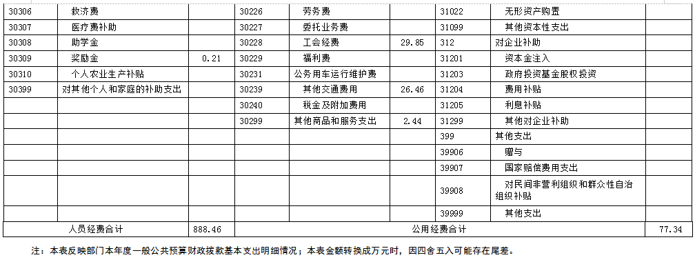 2019年度財政撥款基本支出965.80萬元,其中:人員經(jīng)費888.46萬元,主要包括:基本工資225.52萬元、津貼補貼159.01萬元、獎金249.58萬元、績效工資1.06萬元、機關(guān)事業(yè)單位基本養(yǎng)老保險費84.10萬元、職工基本醫(yī)療保險繳費30.71萬元、其他社會保障繳費18.57萬元、住房公積金46.23萬元、離休費25.53萬元、退休費47.94萬元、獎勵金0.21萬元;公用經(jīng)費77.34萬元,主要包括:辦公費5.51萬元、電費0.57萬元、差旅費2.15萬元、維修(護)費2.26萬元、公務(wù)接待費4.02萬元、工會經(jīng)費29.85萬元、其他交通費用26.46萬元、其他商品服務(wù)支出2.44萬元、辦公設(shè)備購置4.08萬元等。