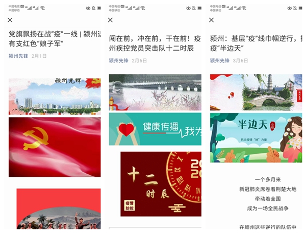 新冠肺炎疫情防控阻擊戰(zhàn)打響之時,潁州區(qū)黨員電教中心通過先鋒信息平臺網(wǎng)格體系,深入宣傳報道各地區(qū)各部門聯(lián)防聯(lián)控和措施成效,生動講述不同身份、不同職業(yè)群體在防疫抗疫一線的感人事跡,展現(xiàn)基層黨員的擔當,增強防控疫情信心,營造良好社會氛圍。 “潁州先鋒”微信公眾號連續(xù)推出一系列“土味宣傳員”、“小小防疫宣傳員”、“紅色娘子軍”、“紅色代辦員”、“疾控人的十二時辰”等推文作品將抗擊疫情過程中的拼搏、奉獻以及戰(zhàn)斗成果真實展示,鼓舞人心,極具凝聚力。多渠道、近距離地將中央、省委、市委和區(qū)委關(guān)于防控新型冠狀病毒肺炎疫情的決策部署傳遞到街頭巷尾、田間地頭,引導(dǎo)群眾不信謠、不造謠、不傳謠,增強戰(zhàn)勝疫情信心,營造良好社會氛圍。截至3月底,經(jīng)潁州先鋒網(wǎng)采用編發(fā)疫情防控新聞144篇、通過潁州先鋒微信公眾號先后編發(fā)推送疫情防控相關(guān)圖文84篇,其中人民網(wǎng)安徽頻道采用6篇,新華絲路采用9條,學習強國采用21條,中國教育報采用2條,安徽日報采用2篇,中安在線阜陽頻道采用4條,阜陽新聞采用線索47條,兩報兩臺采用的篇目及線索若干。有效引導(dǎo)群眾進一步增強辨別能力和防控意識,展示先鋒形象,凝聚眾志成城抗疫情的強大力量。