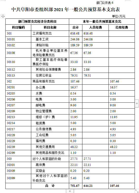 6.中共阜陽市委組織部2021年一般公共預(yù)算基本支出表