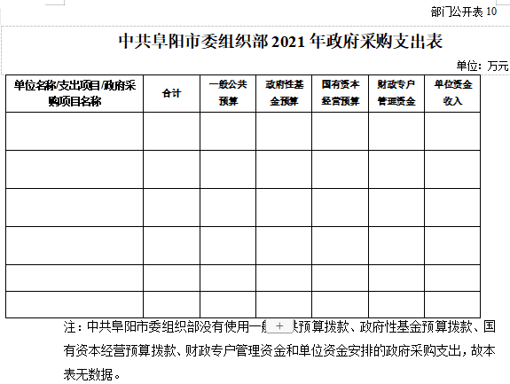 中共阜陽市委組織部2021年沒有使用一般公共預(yù)算撥款、政府性基金預(yù)算撥款、國有資本經(jīng)營預(yù)算撥款、財(cái)政專戶管理資金和單位資金安排的政府采購支出。