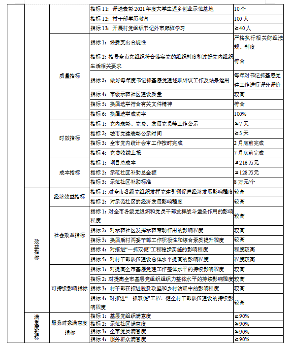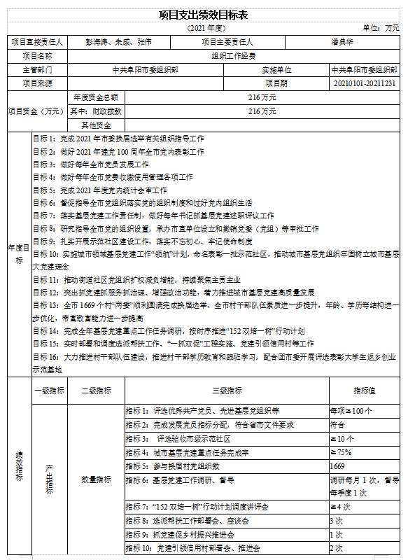 (5)項(xiàng)目內(nèi)容:以《阜陽市城市基層黨的建設(shè)工作重點(diǎn)任務(wù)推進(jìn)清單》為抓手,結(jié)合城市社區(qū)“三聯(lián)四建”活動(dòng),按照城市基層黨建省級示范社區(qū)建設(shè)標(biāo)準(zhǔn),實(shí)施城市領(lǐng)域基層黨建工作“領(lǐng)航”計(jì)劃,嚴(yán)格審核把關(guān)過程,扎實(shí)開展示范社區(qū)建設(shè)工作,及時(shí)總結(jié)推廣經(jīng)驗(yàn)做法,強(qiáng)化典型引路,發(fā)揮示范帶動(dòng)作用,推動(dòng)城市基層黨組織牢固樹立城市基層大黨建理念,聚焦主責(zé)主業(yè),進(jìn)一步推動(dòng)全市城市基層黨建工作創(chuàng)新發(fā)展,提升整體水平。指導(dǎo)全市1669個(gè)村“兩委”順利完成換屆,進(jìn)一步加強(qiáng)村“兩委”干部隊(duì)伍建設(shè),推進(jìn)基層組織建設(shè),助力鄉(xiāng)村振興戰(zhàn)略,打贏脫貧攻堅(jiān)戰(zhàn),夯實(shí)基層基礎(chǔ)。根據(jù)中共安徽省委組織部《關(guān)于大力實(shí)施“四提升行動(dòng)”推深做實(shí)“一抓雙促”工程方案》(皖組發(fā)〔2019〕5號)等文件,堅(jiān)持以習(xí)近平習(xí)近平新時(shí)代中國特色社會(huì)主義思想為引領(lǐng),貫徹落實(shí)新時(shí)代黨的建設(shè)總要求和黨的組織路線,以開展“不忘初心、牢記使命”主題教育為契機(jī),大力實(shí)施農(nóng)村黨員干部本領(lǐng)提升行動(dòng)、新型集體經(jīng)濟(jì)提升行動(dòng)、扶貧領(lǐng)域作風(fēng)建設(shè)提升行動(dòng)、鄉(xiāng)村治理提升行動(dòng),推深做實(shí)“一抓雙促”工程。做好2021年市委換屆選舉各項(xiàng)工作,指導(dǎo)8個(gè)縣市區(qū)黨委換屆選舉各項(xiàng)工作,研究指導(dǎo)全市黨的組織制度建設(shè)工作;檢查和掌握縣級黨組織執(zhí)行的黨的組織制度和黨內(nèi)生活制度情況;檢查指導(dǎo)黨委(黨組)民主生活會(huì)制度的執(zhí)行情況;研究指導(dǎo)全市黨的組織設(shè)置,承辦市直單位設(shè)立和撤銷黨委(黨組)及跨市、跨縣(市、區(qū))黨組織改變領(lǐng)導(dǎo)關(guān)系的審批工作;研究指導(dǎo)縣(市、區(qū))和基層黨組織定期召開黨的代表大會(huì)換屆選舉工作,承辦縣(市、區(qū))召開黨的代表大會(huì)請示的審批、市黨的代表大會(huì)、黨的代表會(huì)議的有關(guān)事項(xiàng);負(fù)責(zé)全市黨的基層組織建設(shè)和黨員隊(duì)伍建設(shè)的綜合協(xié)調(diào)工作;研究指導(dǎo)全市組織員隊(duì)伍建設(shè);承辦市委及本部開展的黨內(nèi)有關(guān)表彰工作;承辦市委審批的追認(rèn)優(yōu)秀共產(chǎn)黨員稱號的相關(guān)工作;負(fù)責(zé)全市黨組織統(tǒng)計(jì)、黨員統(tǒng)計(jì)和黨費(fèi)管理工作。黨代表聯(lián)絡(luò)服務(wù),組織黨代表培訓(xùn)、調(diào)研、視察,黨代表提議提案辦理,完成代表工作室建設(shè)。做好專題民主生活會(huì)、黨建述職評議、黨員發(fā)展統(tǒng)計(jì)、基層黨組織標(biāo)準(zhǔn)化建設(shè)、發(fā)展壯大黨員隊(duì)伍,推動(dòng)黨組織和黨員發(fā)揮作用,加強(qiáng)組織領(lǐng)導(dǎo)和工作指導(dǎo)。