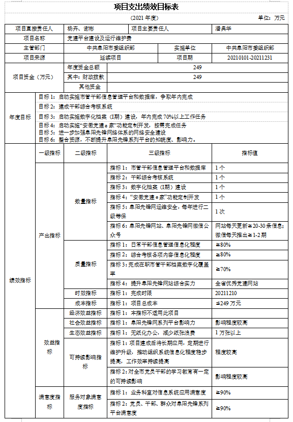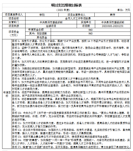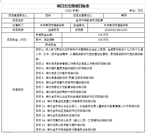 2021年,中共阜陽市委組織部12個(gè)項(xiàng)目實(shí)行了績效目標(biāo)管理,涉及一般公共預(yù)算當(dāng)年財(cái)政撥款2362萬元、政府性基金預(yù)算當(dāng)年財(cái)政撥款0萬元、國有資本經(jīng)營預(yù)算當(dāng)年財(cái)政撥款0萬元、財(cái)政專戶管理資金當(dāng)年安排0萬元和單位資金安排安排0萬元。