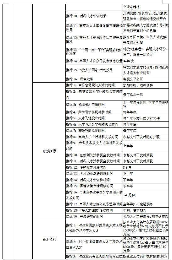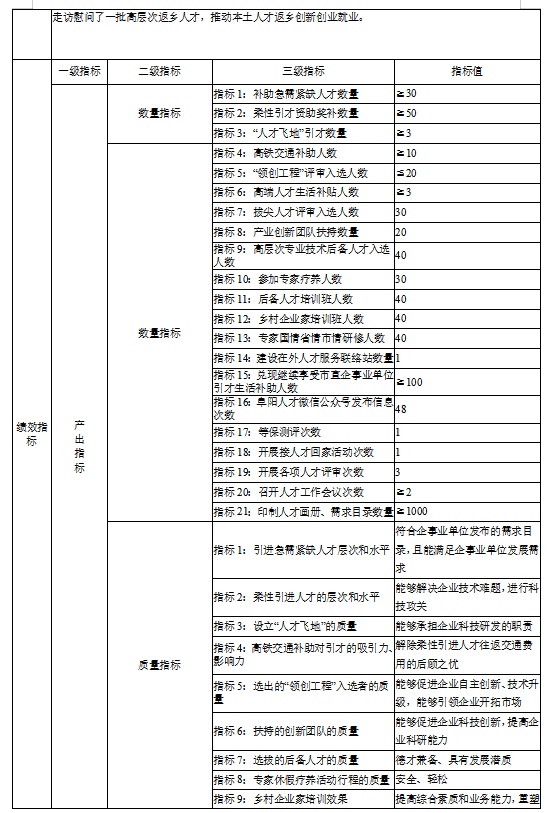 (2)立項(xiàng)依據(jù):《阜陽市促進(jìn)企業(yè)人才建設(shè)20條》(阜辦發(fā)〔2019〕10號)、《關(guān)于深化人才發(fā)展體制機(jī)制改革的實(shí)施意見》(阜發(fā)〔2018〕22號)、《中共阜陽市委 阜陽市人民政府關(guān)于實(shí)施“潁淮英才計(jì)劃”夯實(shí)創(chuàng)新發(fā)展人才基礎(chǔ)的若干意見》(阜發(fā)〔2018〕23號)、《關(guān)于印發(fā)<阜陽市人才高地建設(shè)工程實(shí)施方案>的通知》(阜調(diào)轉(zhuǎn)促領(lǐng)〔2016〕8號)、《阜陽市杰出人才獎(jiǎng)勵(lì)辦法》(辦〔2015〕63號)、《在廣大知識(shí)分子中深入開展“弘揚(yáng)愛國奮斗精神、建功立業(yè)新時(shí)代”活動(dòng)的實(shí)施方案》(阜組發(fā)〔2019〕3號)、《阜陽市在外人才服務(wù)聯(lián)絡(luò)站設(shè)立管理辦法(試行)》(阜組發(fā)〔2019〕2號)。