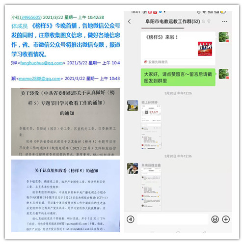 精心部署,及時有力組織。利用全市電教遠教工作微信群、QQ群及時轉(zhuǎn)發(fā)中央及省市要求,詳細對節(jié)目播出的時間和頻道進行預(yù)告,并在阜陽先鋒網(wǎng)、先鋒微信和阜陽電視臺黨建視點欄目及時推送。同時充分發(fā)揮電教遠教覆蓋廣、傳播快的“大系統(tǒng)”優(yōu)勢,通過全市2499個遠教終端站點、164個遠教文化廣場,組織全市各級黨組織和廣大黨員做好《榜樣5》專題節(jié)目的收聽收看工作。
