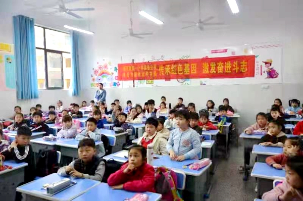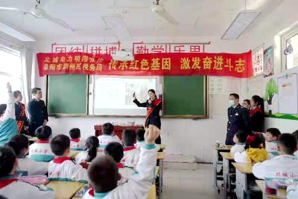 傳頌好紅色故事,傳承好紅色基因。近日,在阜陽市北城小學(xué)電力明園分校課堂上,潁州區(qū)稅務(wù)局黨史宣傳員錢福臨正向同學(xué)們生動(dòng)講述毛主席勤奮學(xué)習(xí)、雷鋒持之以恒做好事、劉胡蘭視死如歸等黨史小故事。