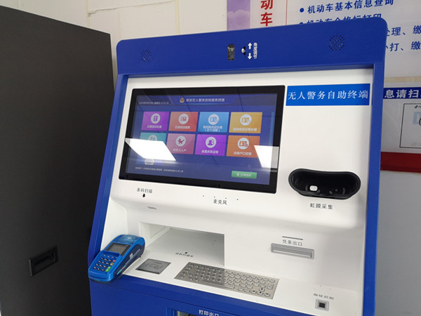 在臨泉縣行政服務中心南側(cè),有一個“無人智慧警局”,面積不大,卻是“麻雀雖小五臟俱全”。警局內(nèi)整齊排列著交管、戶政、出入境自助服務終端,每個終端都有詳細的文字使用指引,群眾可在設備上自助辦理戶政、交管十余項業(yè)務。