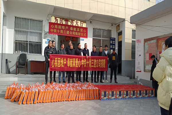 “心系困難戶、奉獻(xiàn)真愛心,在新春佳節(jié)即將來臨之際,捐贈(zèng)物資只是我們愛心和心意的一種表達(dá),為關(guān)愛農(nóng)村的困難群眾盡一點(diǎn)力所能及的綿薄之力,擔(dān)負(fù)起應(yīng)有的社會(huì)責(zé)任,是我們應(yīng)該做的?!敝需F十局集團(tuán)三建公司的工作人員如是說。并向常年戰(zhàn)斗在農(nóng)村一線的黨員干部送上誠(chéng)摯的敬意和衷心的祝福。