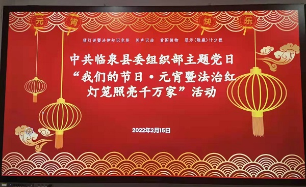 為充分發(fā)揮傳統(tǒng)節(jié)日厚植家國(guó)情懷、培育精神家園的重要作用,創(chuàng)新黨建帶工建活動(dòng)載體,豐富黨員組織生活,根據(jù)縣文明辦《關(guān)于開(kāi)展2022年“我們的節(jié)日·春節(jié)”“我們的節(jié)日·元宵”主題活動(dòng)的通知》及縣法治宣傳教育領(lǐng)導(dǎo)小組辦公室《關(guān)于開(kāi)展臨泉縣第五屆“法治紅燈籠照亮千萬(wàn)家”活動(dòng)的通知》要求,2月15日,臨泉縣委組織部舉辦了“‘我們的節(jié)日·元宵’暨‘法治紅燈籠照亮千萬(wàn)家’”主題黨日活動(dòng)。