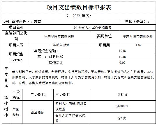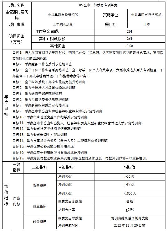 2022年,中共阜陽(yáng)市委組織部11個(gè)項(xiàng)目實(shí)行了績(jī)效目標(biāo)管理,一般公共預(yù)算當(dāng)年財(cái)政撥款4451.71萬(wàn)元。