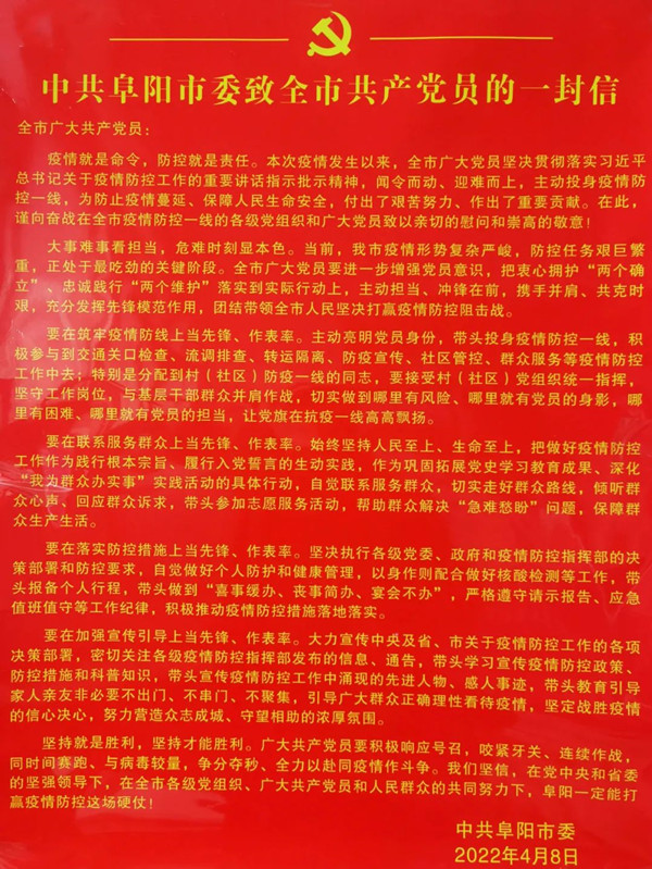 本次疫情發(fā)生以來(lái),阜陽(yáng)市各級(jí)黨組織和廣大黨員堅(jiān)決貫徹落實(shí)習(xí)近平總書(shū)記系列重要講話(huà)指示精神,聞令而動(dòng)、迎難而上,主動(dòng)投身疫情防控一線(xiàn),充分發(fā)揮“兩個(gè)作用”,為防止疫情蔓延、保障人民生命安全提供了堅(jiān)強(qiáng)組織保證。