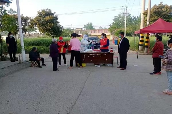 因第二天早晨六點開始進行轄區(qū)內(nèi)人員核酸檢測,陳華玲五點多鐘就來到了檢測點做前期準備工作,布置現(xiàn)場、維護秩序,給排隊等待的老年人搬椅子?!罢埓蠹遗藕藐?,帶好口罩,保持兩米距離……”核酸檢測進行中,陳華玲耐心引導群眾遵守秩序,幫助群眾找身份證號碼便于信息登記。她身穿紅背心、拿著“小喇叭”的忙碌身影,給村民們留下了深刻印象。