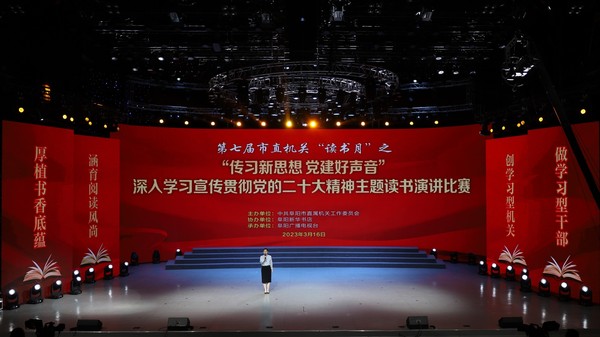 為深入學(xué)習(xí)貫徹習(xí)近平習(xí)近平新時(shí)代中國特色社會主義思想,持續(xù)掀起學(xué)習(xí)貫徹黨的二十大精神熱潮,扎實(shí)推進(jìn)市直創(chuàng)建學(xué)習(xí)型機(jī)關(guān)活動,3月16日下午,由市直工委主辦、阜陽新華書店協(xié)辦、阜陽廣播電視臺承辦的第七屆市直機(jī)關(guān)“讀書月”活動之“傳習(xí)新思想 黨建好聲音”主題讀書演講比賽暨學(xué)習(xí)宣傳貫徹黨的二十大精神征文比賽頒獎儀式在廣播電視臺一樓演播大廳隆重舉辦。市直機(jī)關(guān)160余名黨員干部現(xiàn)場觀賽。活動在網(wǎng)絡(luò)平臺進(jìn)行了同步直播,近7萬名觀眾在線觀看。