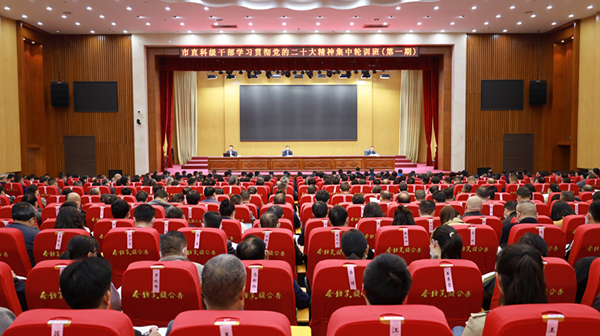為深入學(xué)習(xí)宣傳貫徹黨的二十大精神,4月10日至14日,市直工委在市委黨校舉辦市直科級干部學(xué)習(xí)貫徹黨的二十大精神輪訓(xùn)班(第一期)。市直工委書記李濤出席開班式并為全體學(xué)員授課,市直工委副書記劉智宏做開班動(dòng)員講話,市直400余名科級干部參加本期輪訓(xùn)。