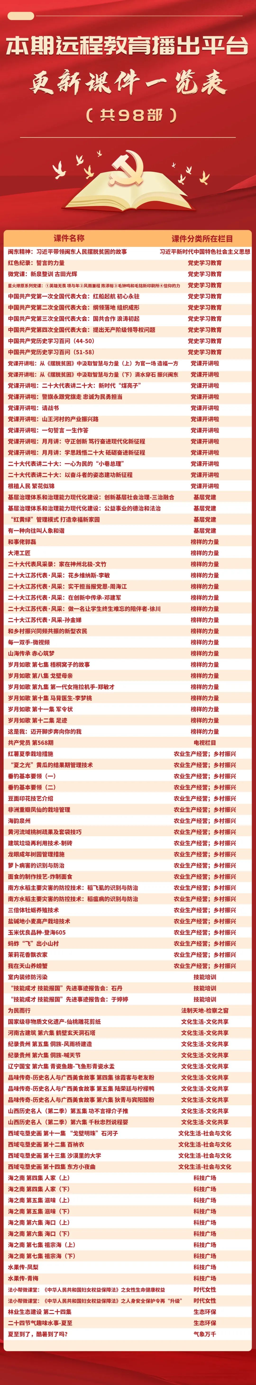 為進(jìn)一步提升黨員遠(yuǎn)程教育學(xué)用結(jié)合實(shí)效,幫助全省基層遠(yuǎn)程教育終端站點(diǎn)更便捷地掌握課件資源庫內(nèi)容,省黨員電教中心通過安徽先鋒微訊定期發(fā)布精品節(jié)目推薦以及最新上傳更新節(jié)目單,請通過遠(yuǎn)程教育終端站點(diǎn)或安徽先鋒網(wǎng)-先鋒網(wǎng)視點(diǎn)播收看。