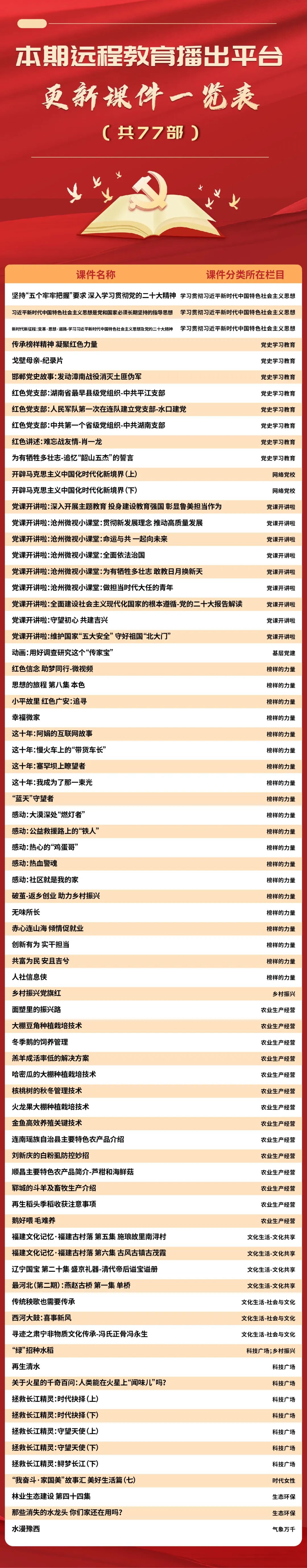 為進一步提升黨員遠程教育學用結(jié)合實效,幫助全省基層遠程教育終端站點更便捷地掌握課件資源庫內(nèi)容,省委組織部黨員教育中心通過安徽先鋒微訊定期發(fā)布精品節(jié)目推薦以及最新上傳更新節(jié)目單,請通過遠程教育終端站點或安徽先鋒網(wǎng)-先鋒網(wǎng)視點播收看。