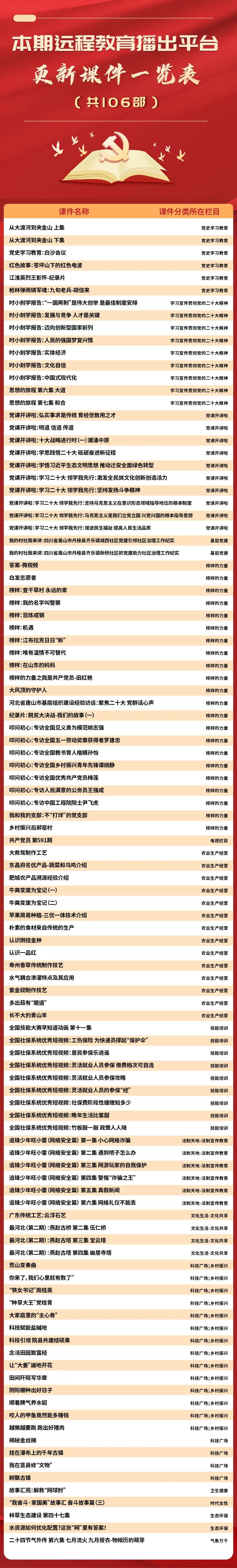 為進一步提升黨員遠程教育學用結合實效,幫助全省基層遠程教育終端站點更便捷地掌握課件資源庫內容,省委組織部黨員教育中心通過安徽先鋒微訊定期發(fā)布精品節(jié)目推薦以及最新上傳更新節(jié)目單,請通過遠程教育終端站點或安徽先鋒網(wǎng)-先鋒網(wǎng)視點播收看。