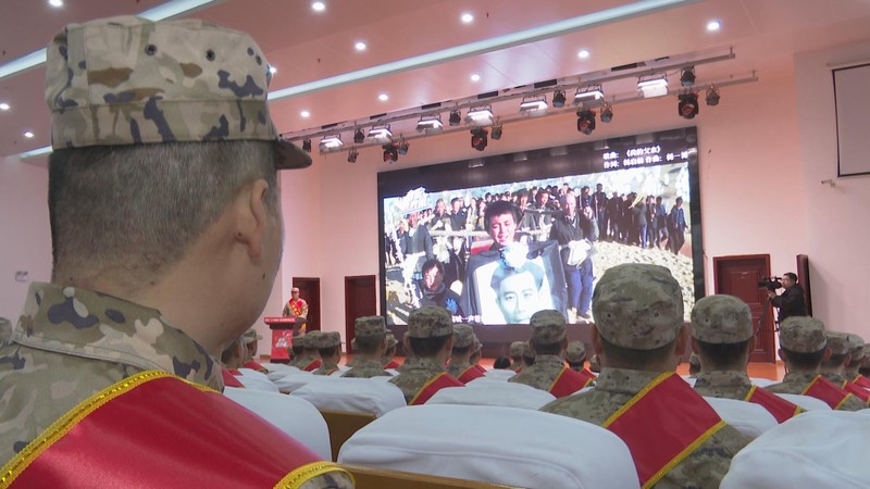 在潁上縣第二中學(xué)第一報(bào)告廳,熟悉的紅色樂章流淌回蕩,點(diǎn)亮一個(gè)個(gè)歷史的精彩瞬間,將藝術(shù)的舞臺(tái)化作思想政治理論課的講臺(tái),在潤物細(xì)無聲中溝通心靈、啟智潤心、激揚(yáng)斗志?!栋霔l棉被》的故事、電影《焦裕祿》的劇情片段、袁隆平、黃文秀等人的感人事跡在大屏幕上生動(dòng)再現(xiàn),臺(tái)下新兵們深受觸動(dòng)。
