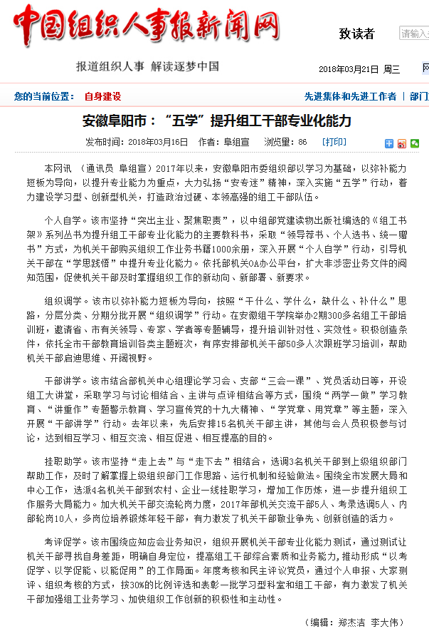 2017年以來,安徽阜陽市委組織部以學習為基礎,以彌補能力短板為導向,以提升專業(yè)能力為重點,大力弘揚“安專迷”精神,深入實施“五學”行動,著力建設學習型、創(chuàng)新型機關,打造政治過硬、本領高強的組工干部隊伍。