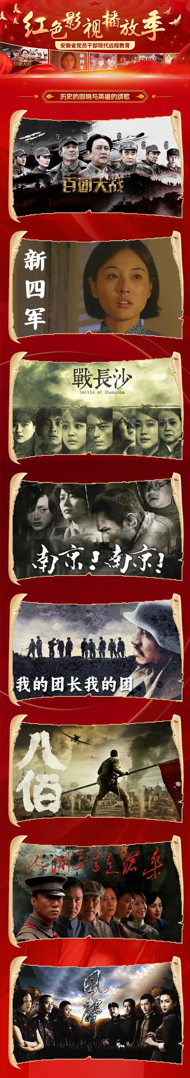 在安徽省黨員干部現代遠程教育—“安徽先鋒”平臺開設“紀念中國人民抗日戰(zhàn)爭暨世界反法西斯戰(zhàn)爭勝利80周年?紅色影視播放季”專題專欄,精選上傳《百團大戰(zhàn)》《新四軍》等75部紅色題材的電影、電視劇和紀錄片。