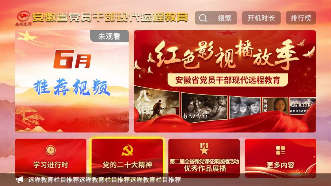 各地基層黨組織依托黨員遠程教育終端站點和戶外遠教大屏,進入安徽省黨員干部現代遠程教育—“安徽先鋒”平臺,點擊“紅色影視播放季”活動專欄,選擇紅色影視節(jié)目播放收看。
