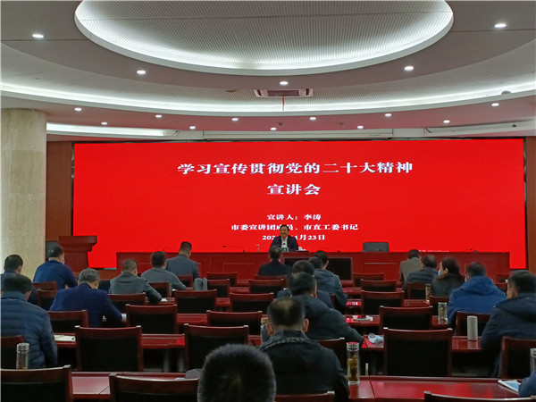 會(huì)議邀請(qǐng)市委宣講團(tuán)成員、市直工委書記李濤同志作了以“守正創(chuàng)新?lián)姑?自我革命譜華章”為主題的宣講報(bào)告,從“深刻領(lǐng)會(huì)黨的二十大主題和重大意義”、“深刻領(lǐng)會(huì)過去五年工作和新時(shí)代十年偉大變革的重大意義”、“深刻領(lǐng)會(huì)習(xí)近平新時(shí)代中國(guó)特色社會(huì)主義思想的世界觀和方法論”、“深刻領(lǐng)會(huì)以中國(guó)式現(xiàn)代化推進(jìn)中華民族偉大復(fù)興興的使命任務(wù)”、“深刻領(lǐng)會(huì)以偉大自我革命引領(lǐng)偉大社會(huì)革命的時(shí)代要求”五個(gè)方面對(duì)黨的二十大精神進(jìn)行了深入闡釋,進(jìn)一步提升了廣大黨員干部的黨性修養(yǎng)、理論素養(yǎng)。